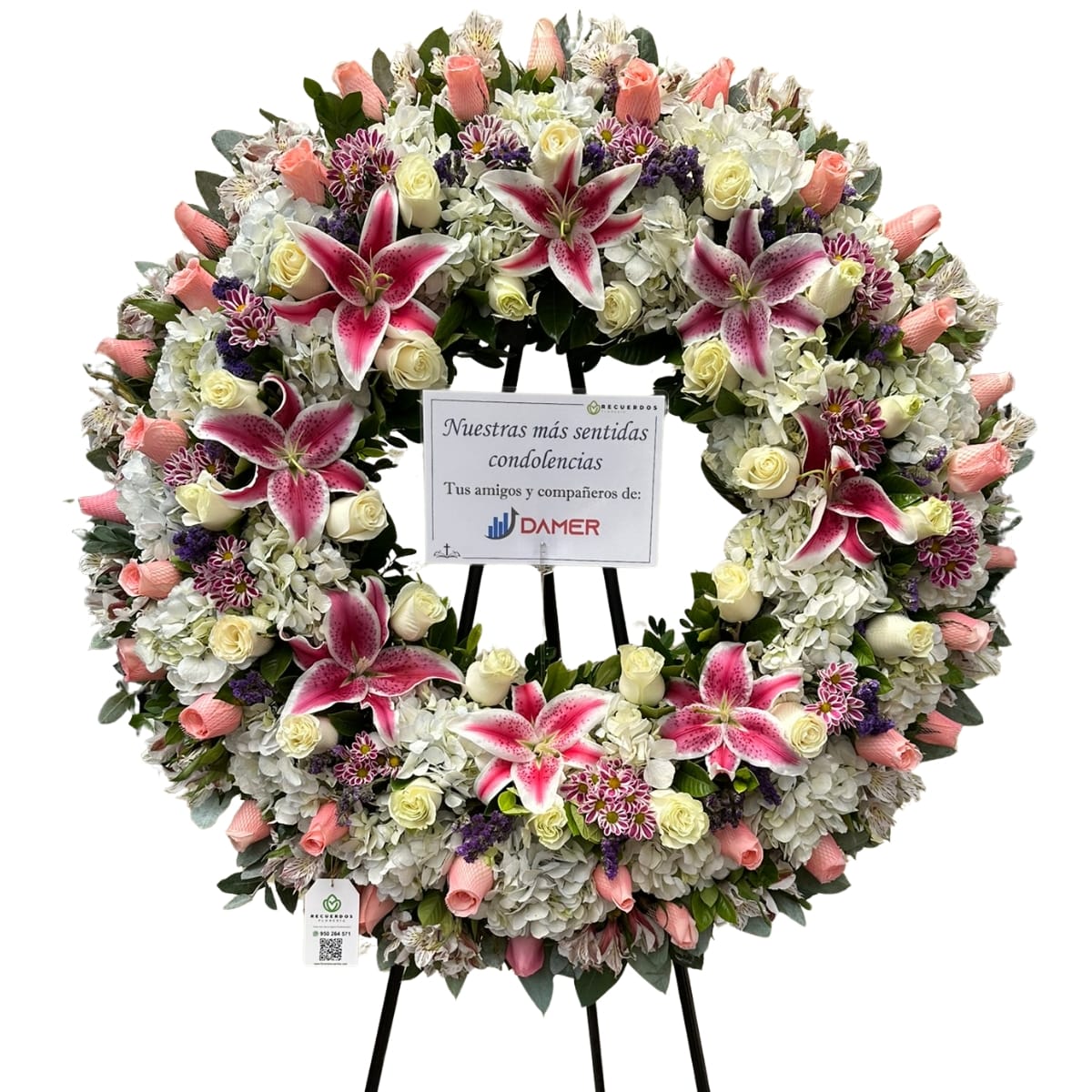 Hermosa corona en parante de fierro con rosas rosadas, astromelias, eucalipto, lilium rosados, hortensias blancas, mirto y finos follajes.