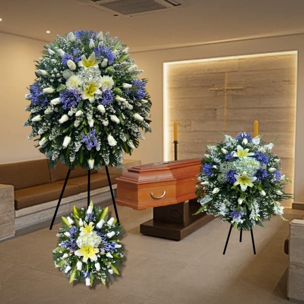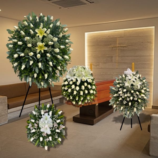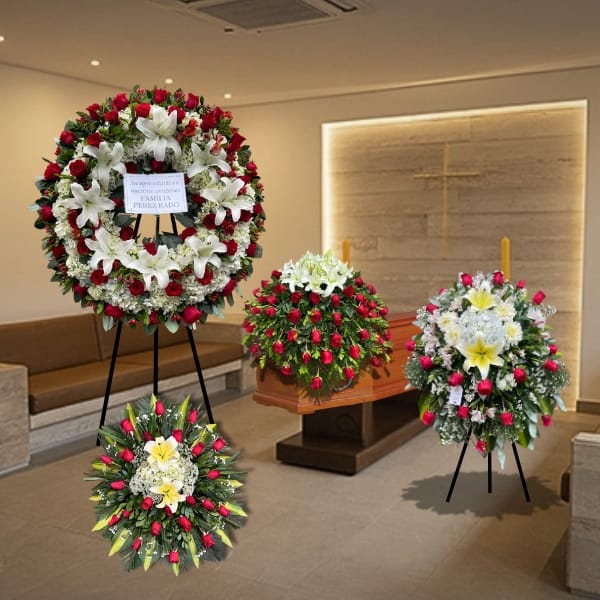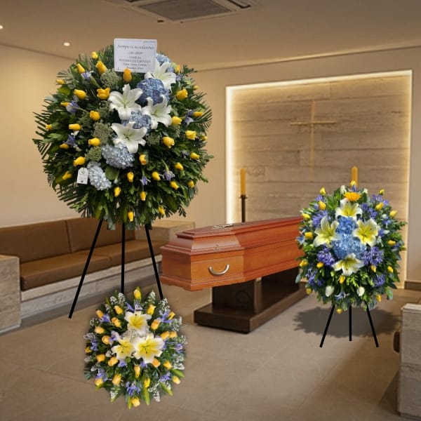 Pack fúnebre que incluye corona, lágrima con parante y lágrima de piso.